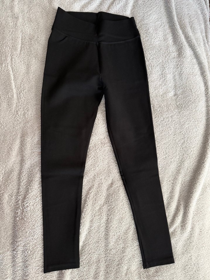 Düz siyah, elastik bel bantlı, sentetik kumaştan yapılmış kadın taytı. Normal boyda ve günlük kullanım için uygundur.
