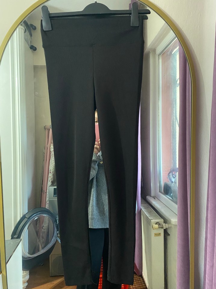 Siyah, yırtmaçlı midi uzunlukta, sentetik kumaştan üretilmiş kadın tayt. Ofis ve gündelik sokak tarzı için uygundur.