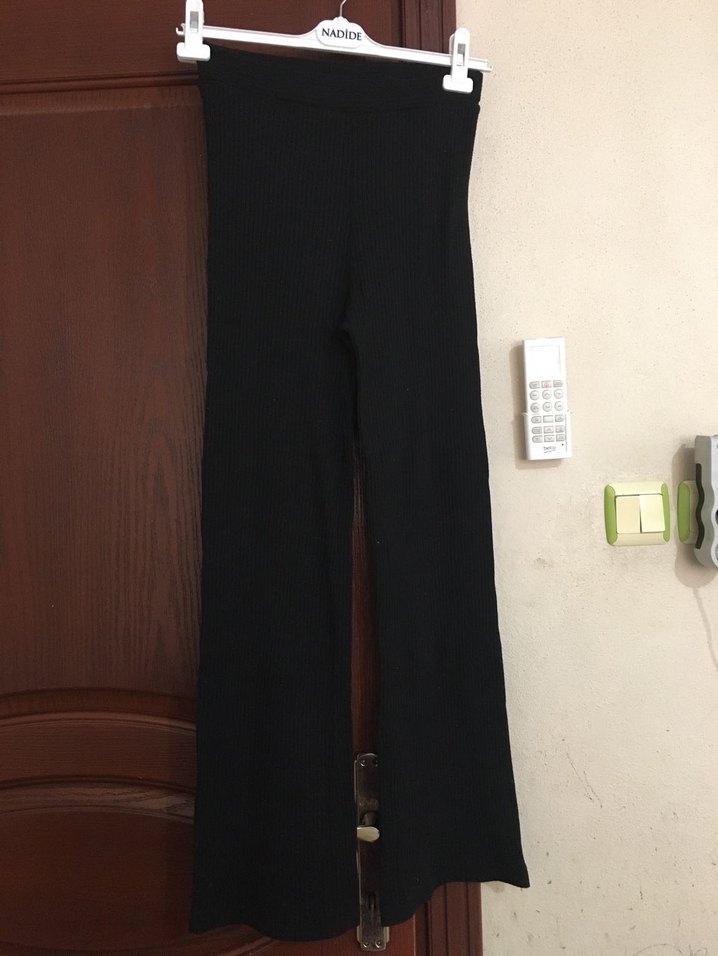 Siyah, esnek sentetik kumaştan yapılmış, rahat ve şık boru paça pantolon. Günlük sokak stiline uygun.