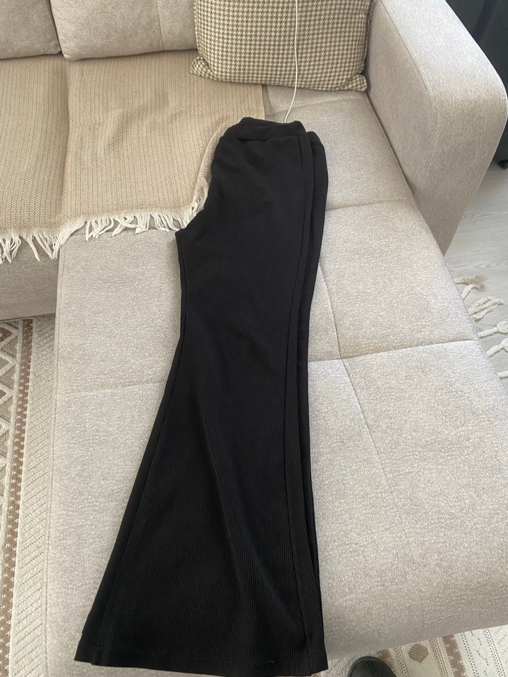 Siyah, uzun paça, vücuda oturan kadın pantolonu. Sentetik kumaştan, drapeli ve minimal tarzda günlük kullanıma uygun. İçi polarlı