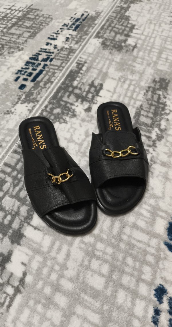 Rana's siyah kadın terlikler, parlak altın zincir tokası ve dolgu topuk ile rahatlığı trend sokak stiliyle birleştirir.