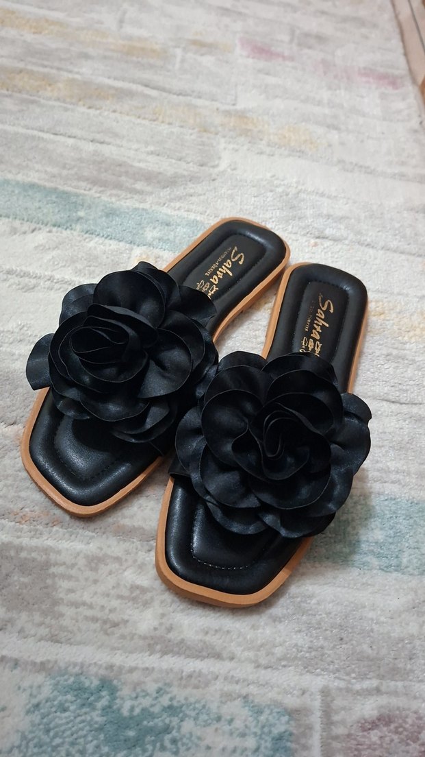 Siyah Kadın Terlik Çiçek Detaylı