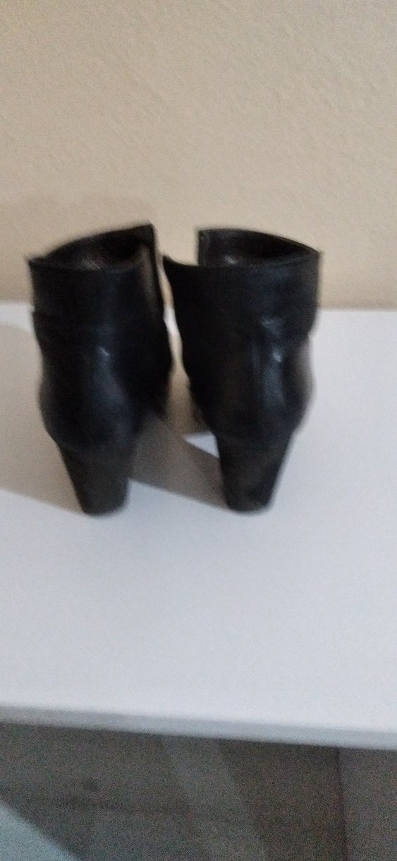 Siyah, tokalı bantlı, kauçuk malzemeden yapılmış, blok topuklu kadın botları. Minimalist ve gotik tarzda, günlük kullanım için uygundur.