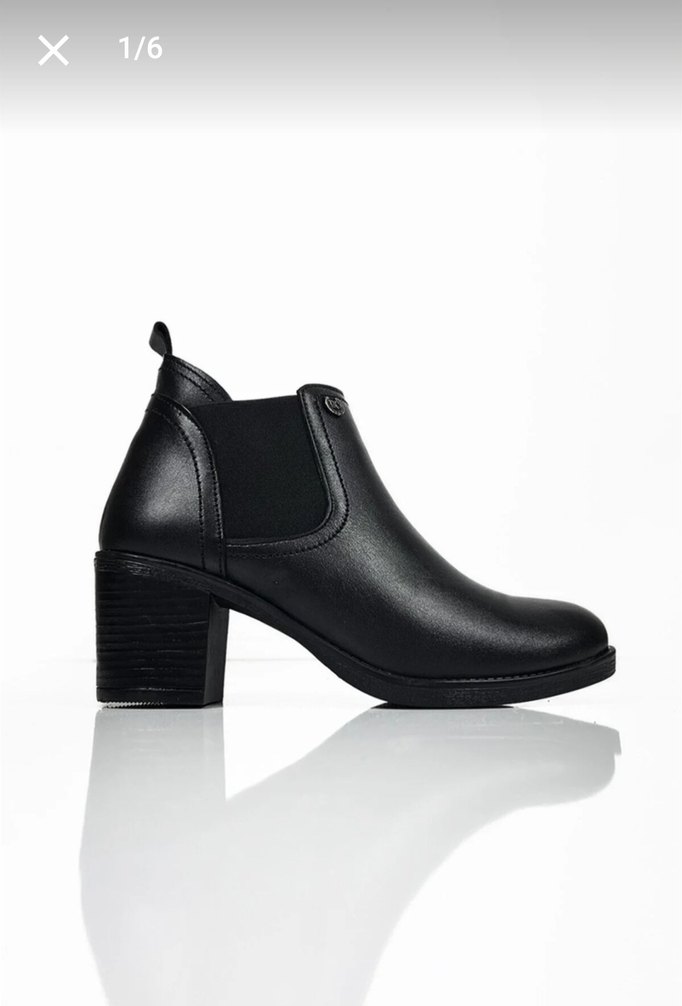 Siyah kadın botları, lastik malzemeden, topuklu ve tokalı detaylıdır. Minimalist ve çağdaş stil ile ofis kullanımı için uygundur.
