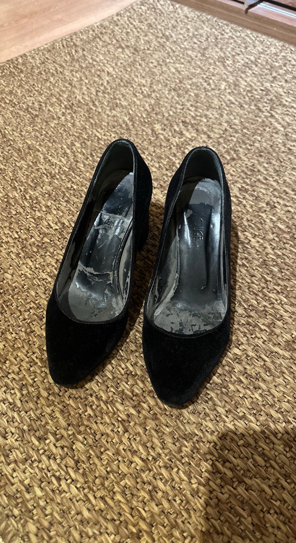 Siyah, blok topuklu kadın stiletto. Klasik gotik tarzda, zahmetsiz şıklık sunar, ofis kullanımı için uygundur.Sorunsuz iç kısımları durduğu yerde soyuldu sadece.