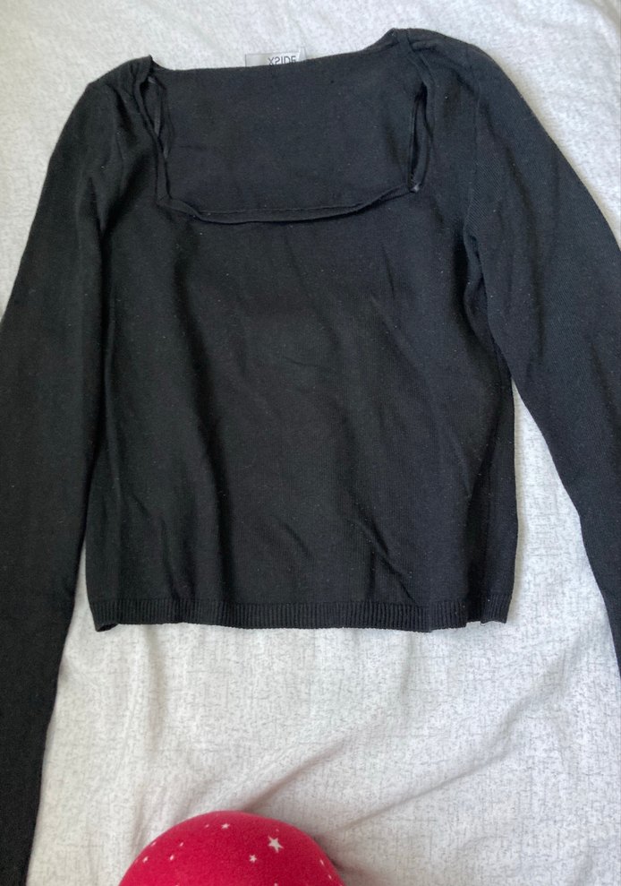 Uzun kollu, kayık yakalı, siyah renkli, keten kumaştan örülmüş, vücuda oturan minimalist gotik tarzda kadın triko bluz.