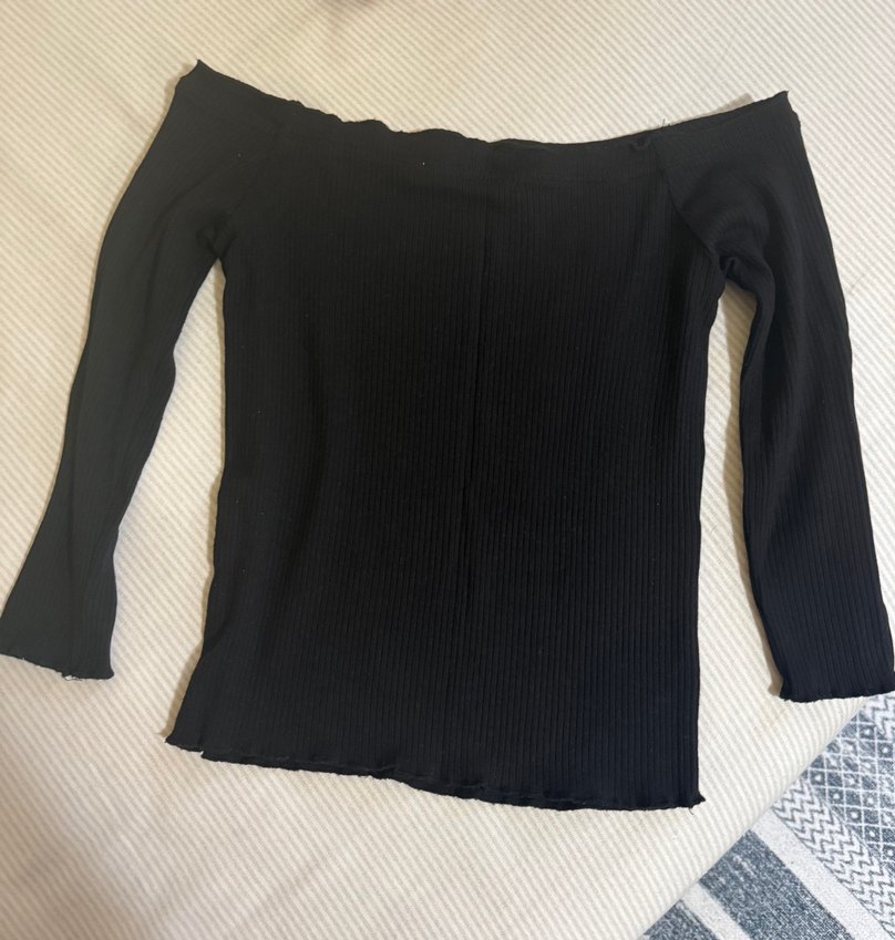 Kayık yakalı, uzun kollu, siyah kadın triko bluz. Yumuşak keten kumaştan, örme dokulu ve midi boyda, rahat günlük sokak stiline uygun.