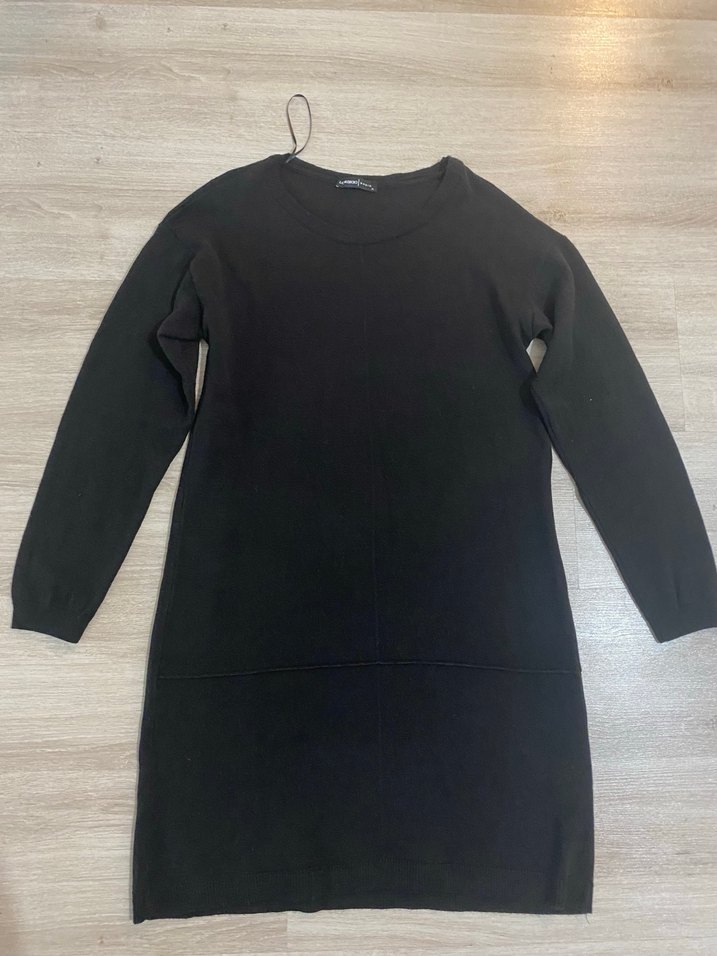 Siyah renk, uzun kollu, yuvarlak yaka ve midi boyda yün kadın triko elbise. Rahat kesimiyle sade ve minimal bir stil sunar.