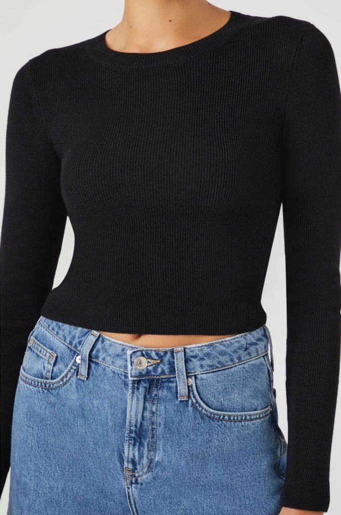 Siyah renkli, ince triko denimden yapılmış, dar kesim uzun kollu kadın sweatshirtü. Normal boyda ve yuvarlak yakalı, günlük rahat kullanım için uygundur.
