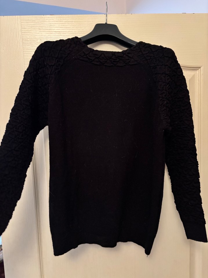 Fitted kesim siyah triko kazak, yuvarlak yaka ve uzun kollu, dokulu örgü detaylı, sade ve rahat tarzda, günlük kullanım için uygun.