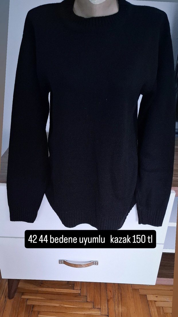 Siyah renkli, uzun kollu, yuvarlak yaka, örme triko kazak. Rahat kesimi ve midi boyu ile günlük kullanıma uygun, 42-44 bedenlere uyumludur.