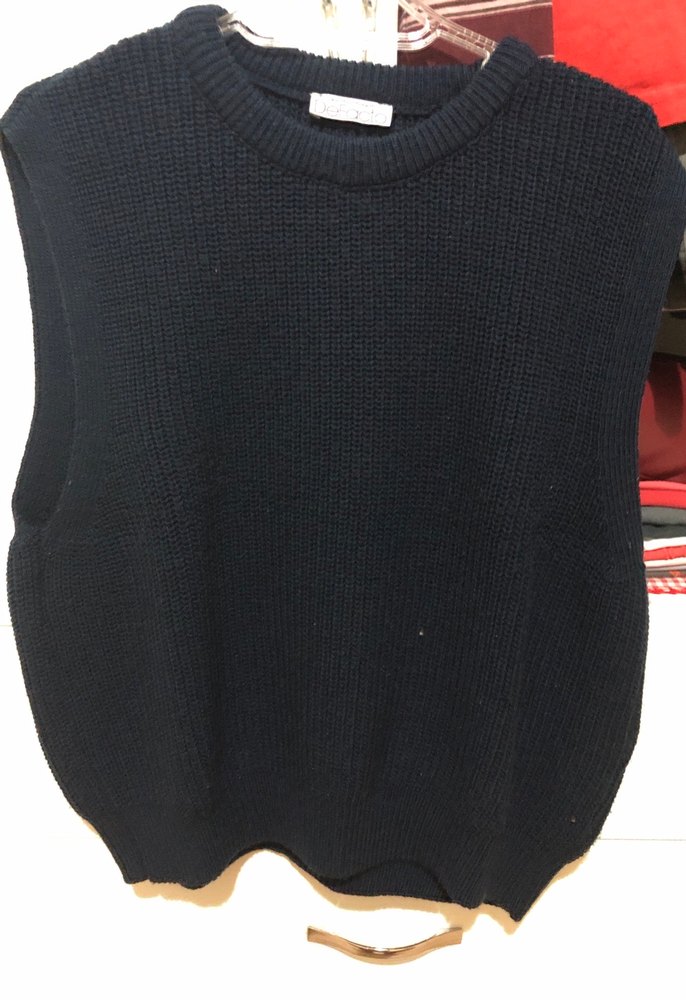Siyah, yün örme, yuvarlak yakalı, kolsuz ve fitted kesime sahip günlük sokak stili süveter. Rahat ve desensiz yapısıyla şık görünür.