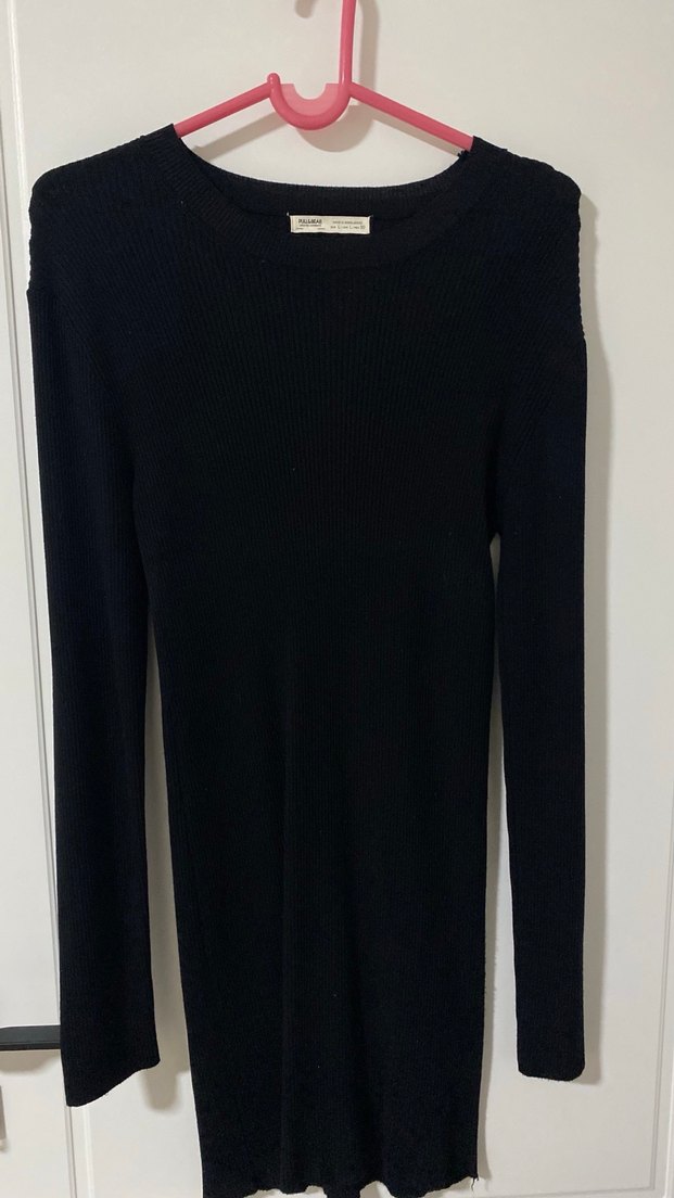 Siyah renkli, uzun kollu ve bisiklet yaka triko elbise. Midi boyda, vücuda oturan kesimiyle sade ve günlük kullanıma uygun.