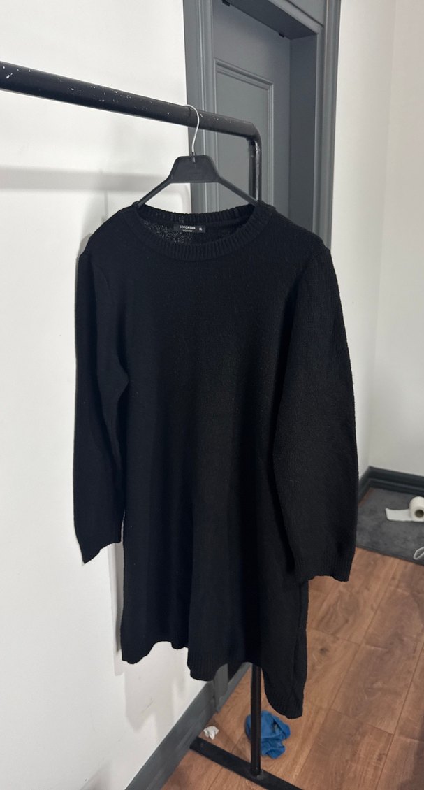 Siyah yün örme kumaştan yapılmış, yuvarlak yaka ve uzun kollu kadın triko midi elbise. Rahat kesimi ve sade tasarımıyla günlük kullanıma uygundur.