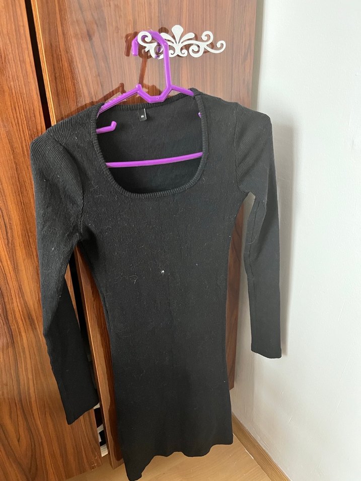 Bu siyah kadın triko elbise, uzun kollu ve yuvarlak yakalıdır. Midi boyda, yumuşak sentetik kumaştan yapılmıştır. Minimalist gotik tarzıyla günlük kullanıma uygundur.