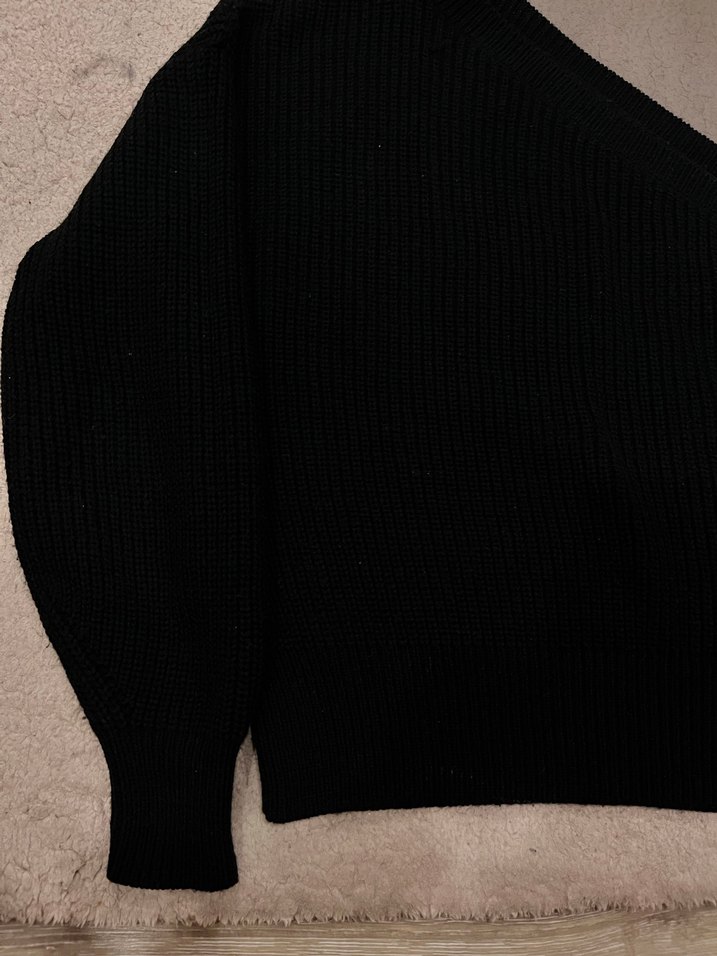 Siyah, yün kumaştan, uzun kollu ve tekne yakalı, rahat ve sade tasarımlı, vücuda oturan örgü kazak. Tek kol detaylı