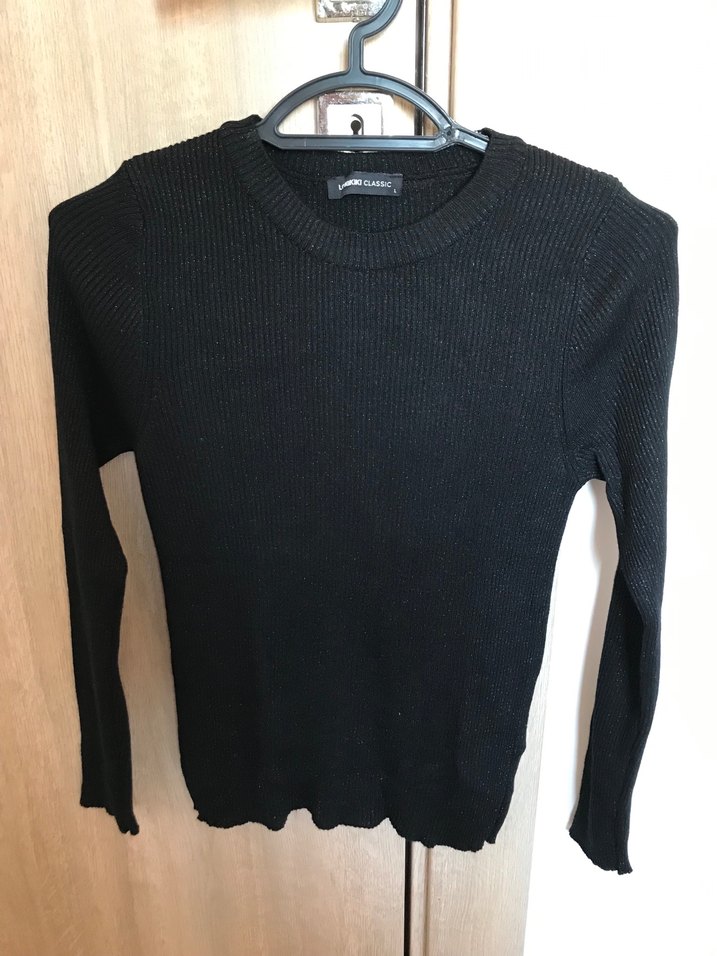 Fitted kesim siyah triko kazak, uzun kollu ve yuvarlak yaka detaylıdır.Siyah kendinden simli esnek yapısı vardır.