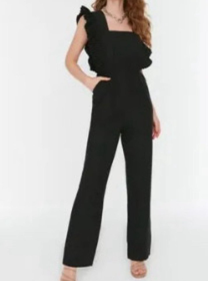 Siyah, kolsuz tulum, volan detayına sahiptir.