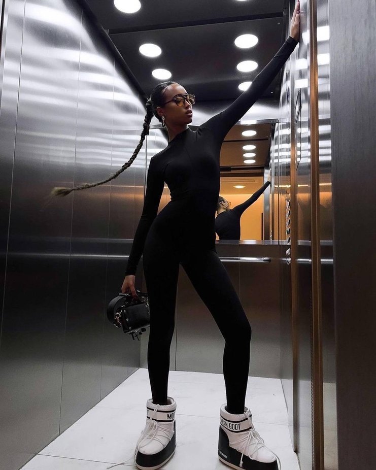 Yüksek yakalı, ince kesim siyah tulum. Spor ve sokak modasına uygun şık tasarım.