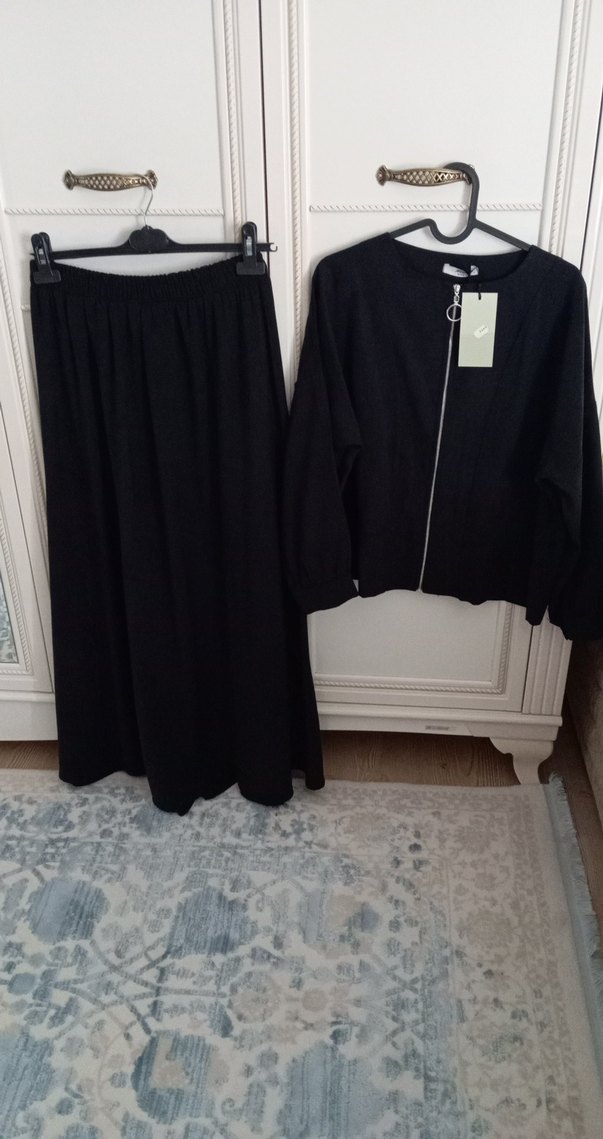 Kadınlar için uzun ve bol kesim, tensel kumaştan yapılmış siyah takım. Uzun kollu, bisiklet yaka ve fermuarlı tasarıma sahip, rahat ve sade stil için uygun. 38,40 beden için uygundur.