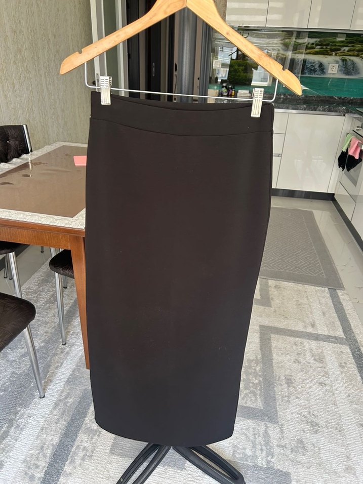 Siyah uzun ve dar kesim etek, düz sentetik kumaştan üretilmiştir. Ofis için uygun, şık ve sade normcore tarzını yansıtır.