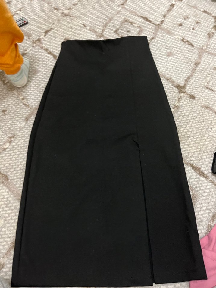Siyah uzun, dar kesim etek, yırtmaç detayıyla minimalist ve günlük şıklık için uygun, sentetik kumaştan üretilmiştir.