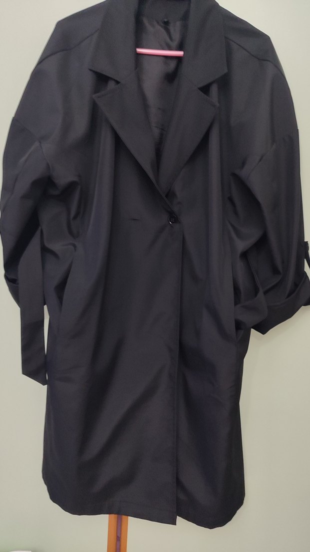 siyah renk 46 beden trençkot boy omuzdan 102 santim 2 kol arası düğme kapalıyken 67 santim cepli beli kuşaklı çok iyi durumda hiçbir de forması yok 10 kez anca giyildi