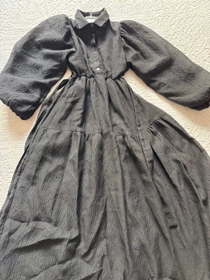 Düğmeli, bol kesim, siyah uzun elbise. Çentikli yaka ve askılı kollarıyla bohem tarzda, günlük kullanıma uygun. 2 kez giydim ama yüksek devirde yıkadığım için tiftik var permatik yada tiftik makinesiyle gidicek bişi oyüzdrn fiyatı uygun son foto görsel amaçlıdır o şekil duruyor
