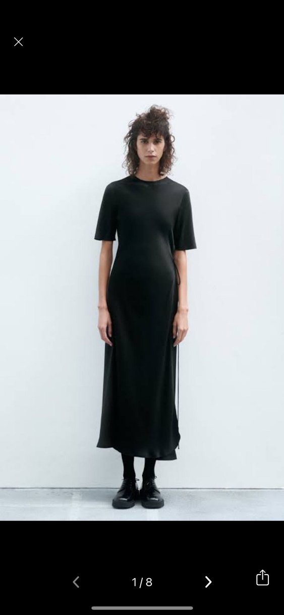Siyah uzun elbise, kısa kollu ve yuvarlak yakalıdır. İpeksi kumaştan olup salaş kesim ile rahat bir şıklık sunar. Günlük kullanım için minimalist tarzda.