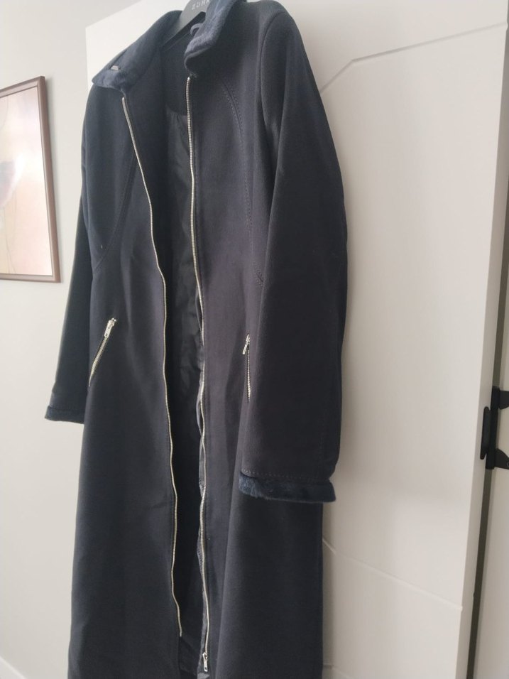 larcivet uzun kaban, düğmeli yakalı ve uzun kolludur. Rahat kesim, fermuarlı cepler ve yumuşak, sıcak kumaştan üretilmiştir.