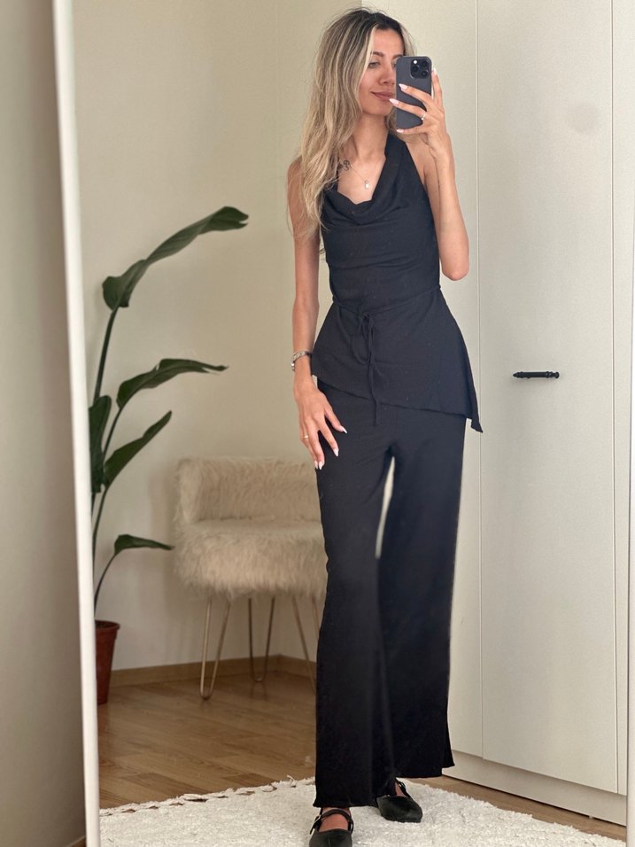 Siyah renkli, ip askılı ve halter yakalı kadın takım ipeksi dokusuyla rahat bir kullanım sunar. Regular kesim ve uzun boyludur, günlük şıklık için uygun.