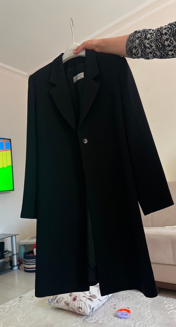 Siyah uzun kadın kaban, düğmeli ve kesimli yakalıdır. İpek gibi kumaştan, klasik ve iş stiline uygun, düz kesim ve uzun kolludur.