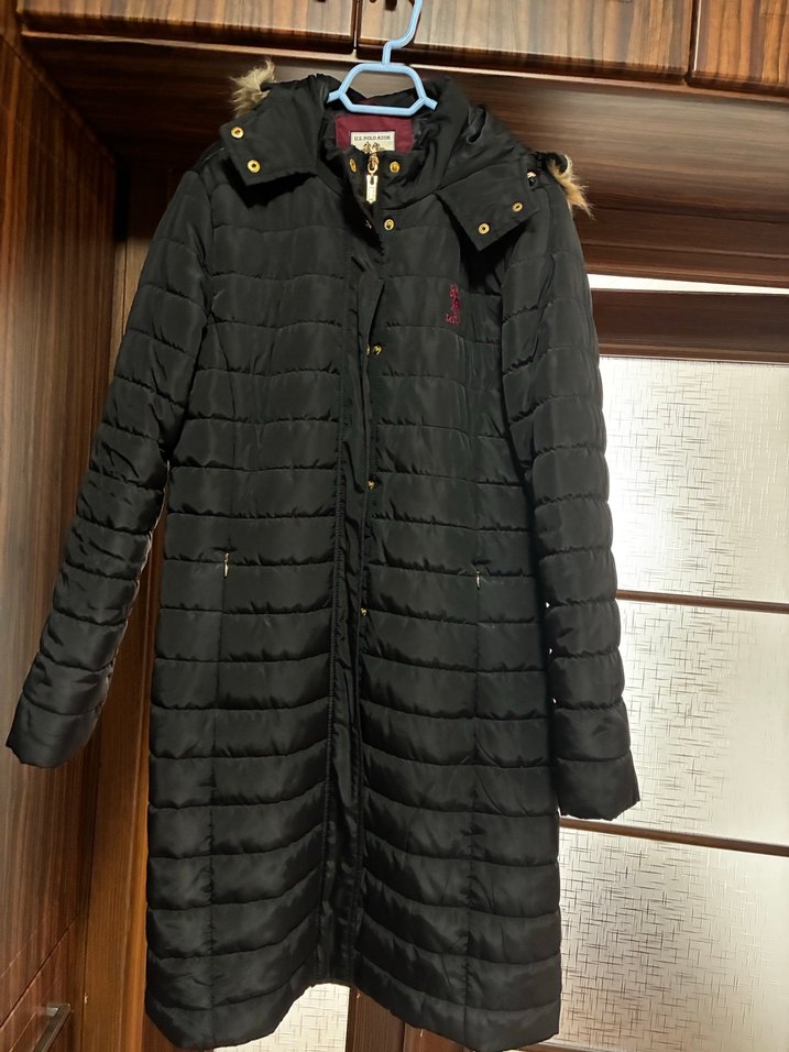 Kadınlar için uzun, oturan kesim kaban. Siyah renkte, sentetik kumaştan, kürklü detaylı ve uzun kollu, günlük kullanıma uygun.Her hangi bir kusuru yok giyildi