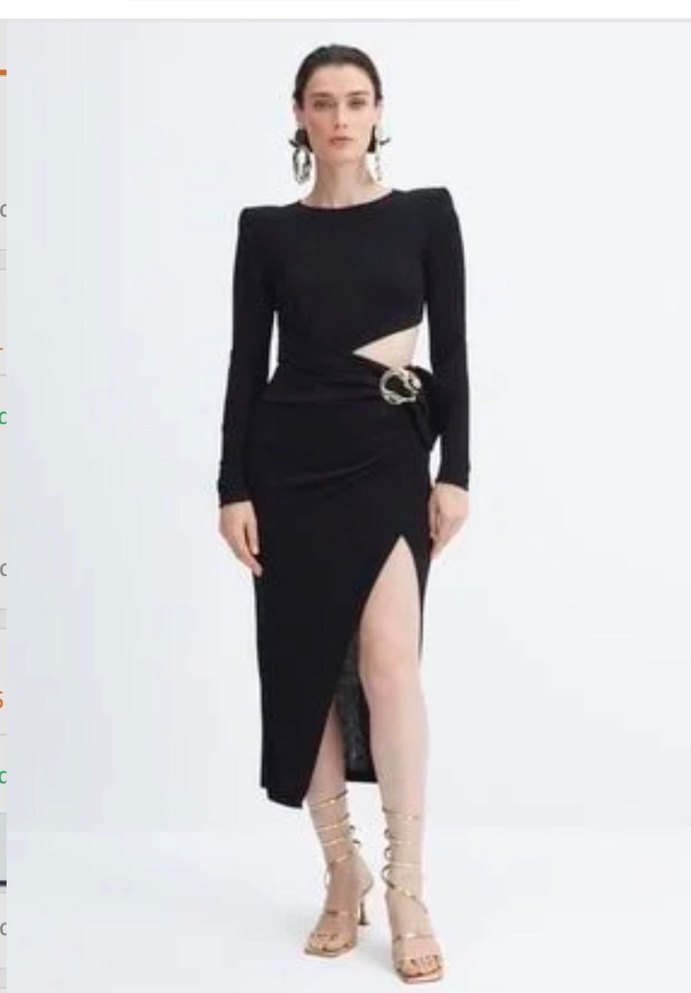 Siyah, uzun kollu, tek omuz kemerli ve yan kesikli fitted uzun elbise. Sentetik kumaştan, romantik akşamlar için uygun.