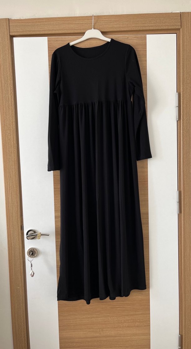 Siyah uzun keten elbise, bol kesim ve pileli detaylara sahiptir. Uzun kollu ve yuvarlak yakalı, günlük kullanıma uygundur.
