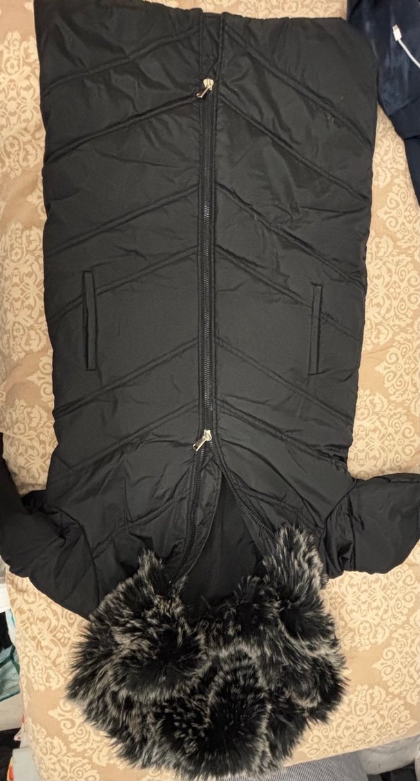 Siyah, uzun kesim ve kürklü detaylı kadın kışlık mont. Sentetik kumaştan,, dış mekan için uygun.şapkası komple kürk 36-42 beden uyumlu. Çift fermuar yani alttan da açılıyor