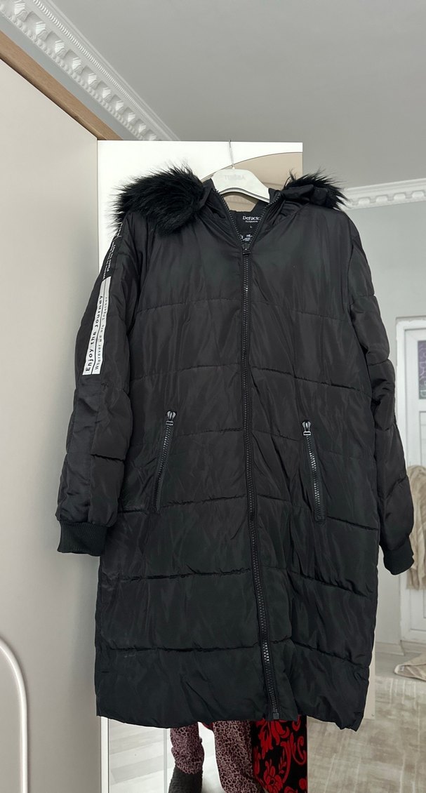 Siyah uzun kışlık mont, kürklü kapüşonlu ve rahat kesimlidir. Yumuşak ve sıcak kumaştan, uzun kollu ve çıtçıtlı ceplidir. Rahat ve şık bir sokak stiline uygundur. ❄️