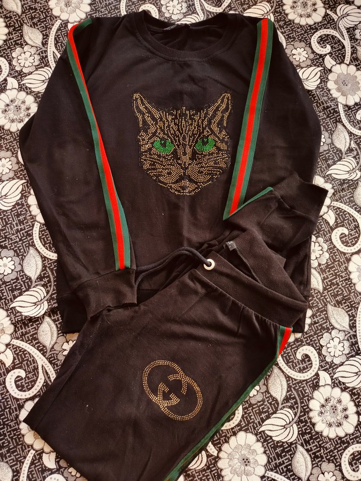 Uzun kollu, bol kesim siyah kadın eşofman takımı, baskılı kedi deseni ve kürk detaylı. Bisiklet yaka, renkli şeritler ile günlük kullanıma uygun.
