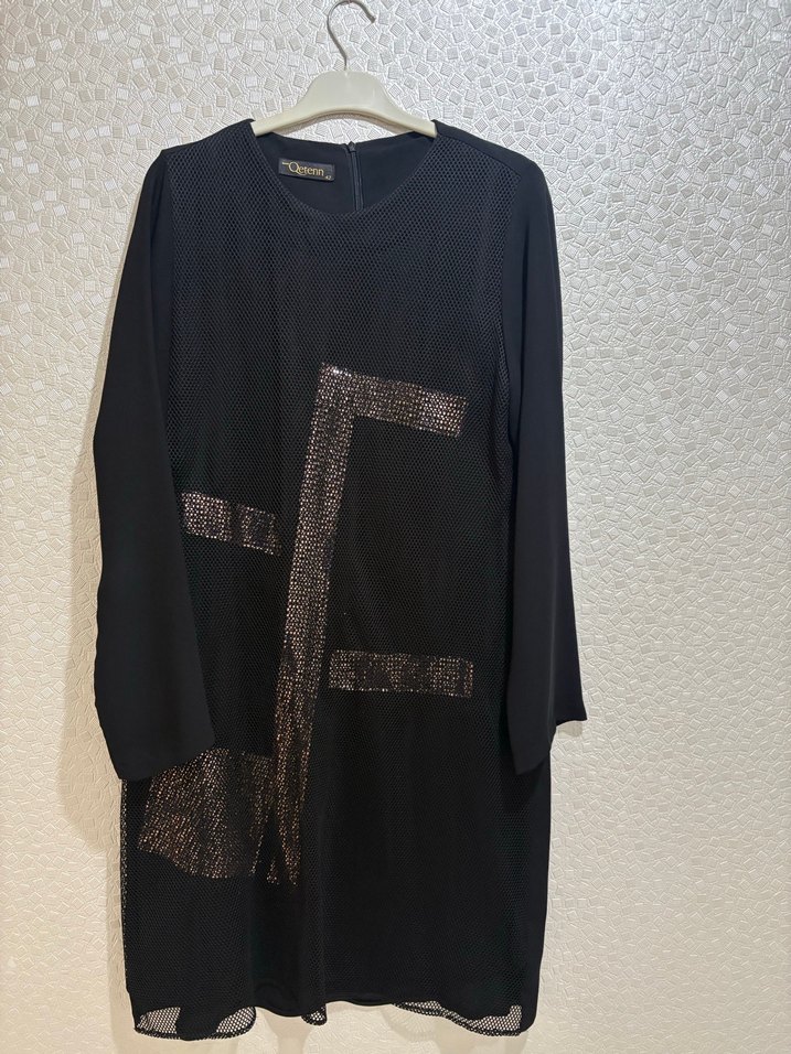 Uzun kollu, yuvarlak yakalı siyah tunik, drapeli baskılı detaylara sahip yumuşak sentetik kumaftan yapılmıştır. Günlük kullanıma uygun, rahat kesim ve çağdaş avant-garde tarzı sunar.