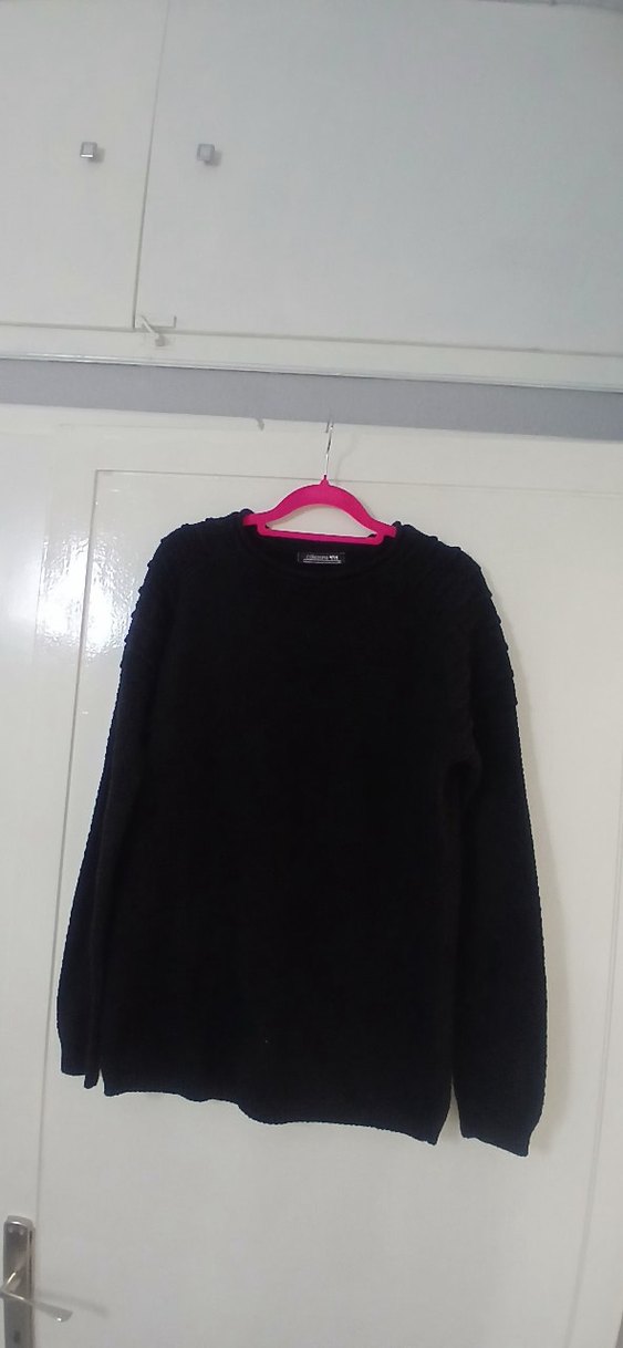 Siyah, uzun kollu, bisiklet yaka kadın kazak. Rahat kesimi ve yumuşak, sıcak kumaşıyla gündelik kullanıma uygundur.
