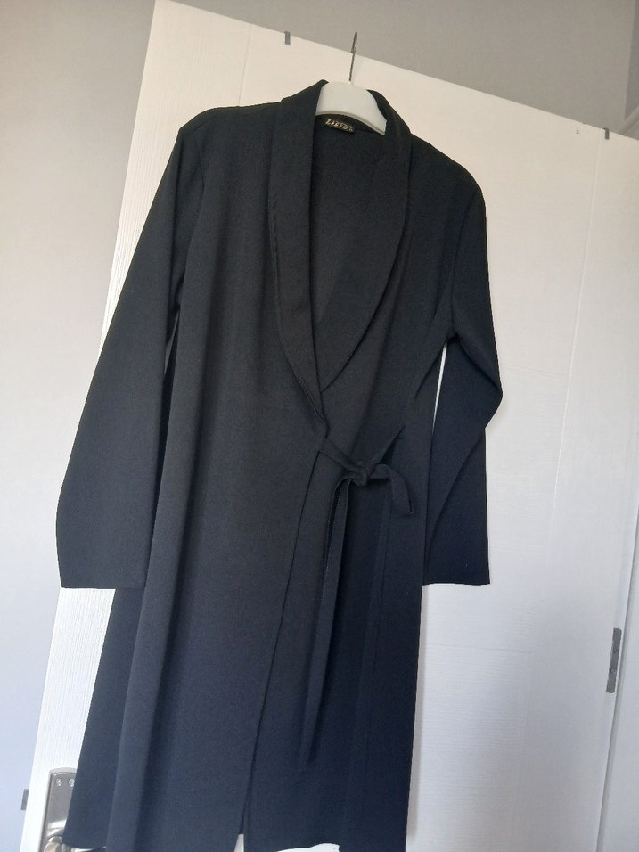 Siyah renkli, ceket Düzenli kesimi ve kuşaklı kapanışı ile iş veya günlük kullanım için uygundur.