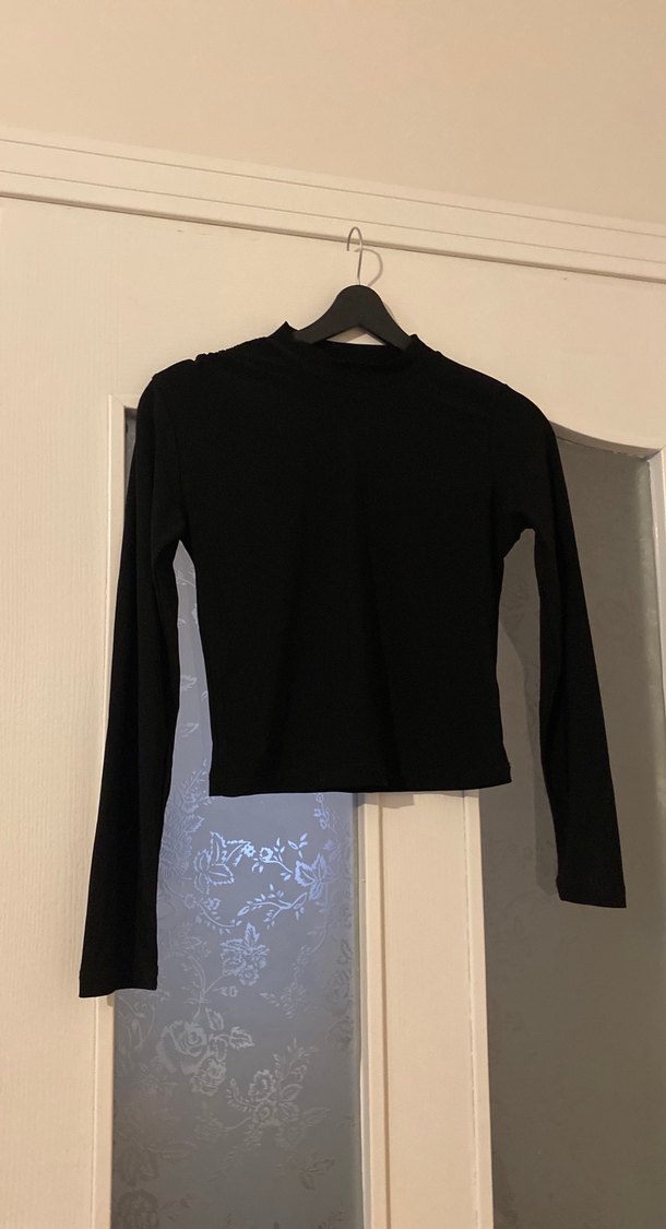 Siyah, uzun kollu ve yüksek yakalı, vücuda oturan midi uzunluğunda kadın gömleği. Düz, sentetik kumaştan sade gotik tarzda günlük kullanıma uygun.