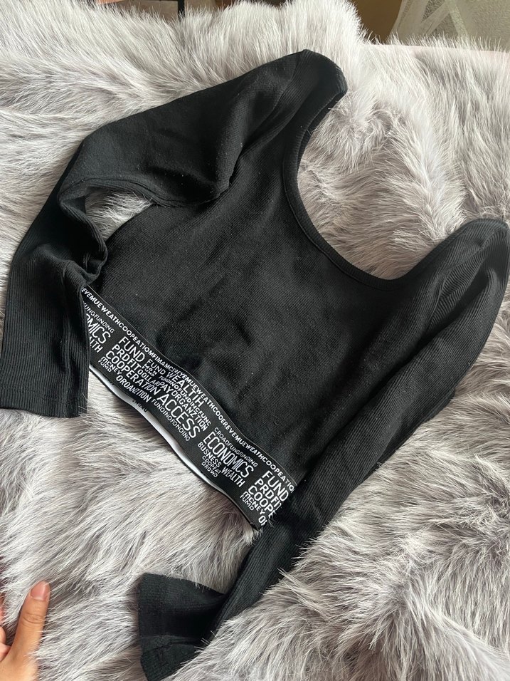 Uzun kollu, tek renk siyah crop top, yumuşak sentetik kumaş ve kürk detaylıdır. Tekne yaka ve bel kısmında baskılı bant bulunur. Rahat ve şık bir tercih.