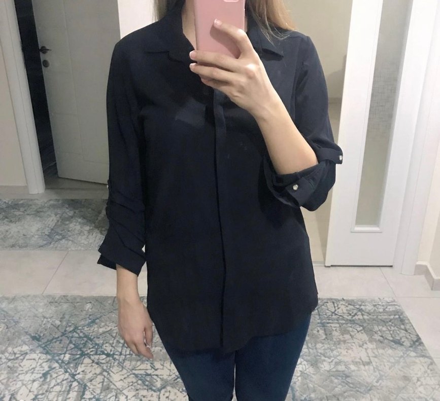 Siyah renkli, kol düğmeli ve yakalı, ipeksi dokulu, uzun kollu, regular fit kadın gömleği. Ofis ve günlük kullanıma uygundur.