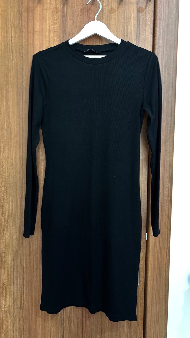 Düz siyah, uzun kollu ve bisiklet yakalı, vücuda oturan uzun elbise. Pürüzsüz sentetik kumaştan, minimal ve normcore tarzda, günlük kullanıma uygun.