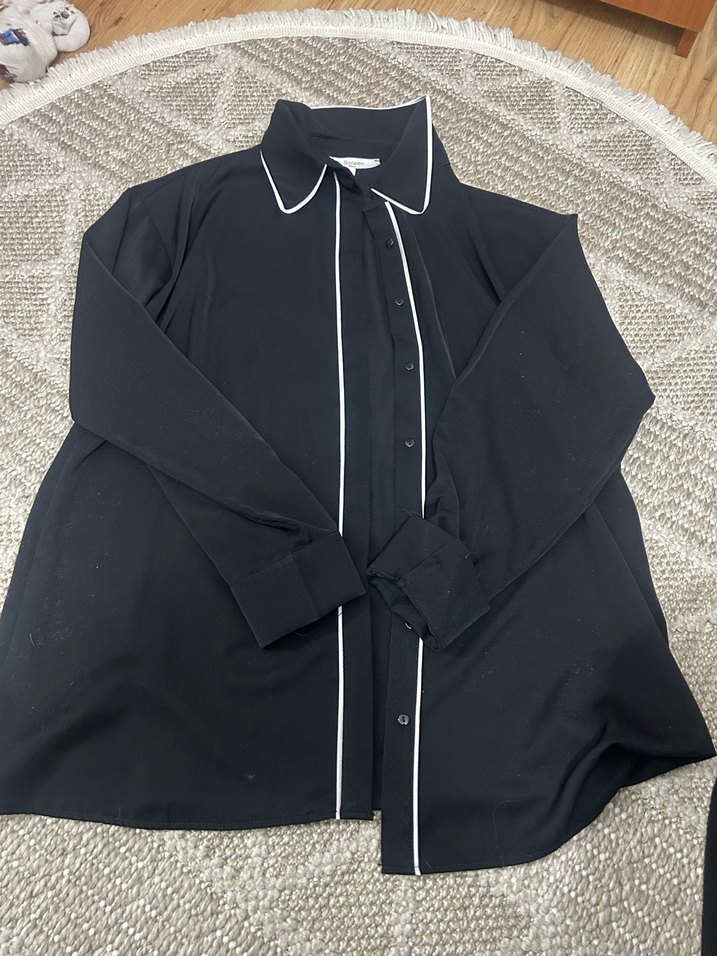 Siyah, uzun kollu, yakalı ve düğmeli kadın gömleği. İpek gibi kumaştan, bol kesim ve minimalist tarzda, ofis için uygun. Çeket olarakta kullanılabilir
