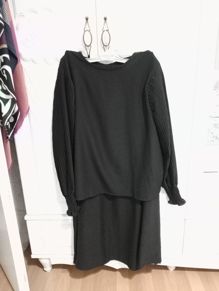 Siyah keten kumaştan uzun kol ve pileli detaylara sahip, yuvarlak yakalı, bol ve uzun kesim triko ikili takım . urun kumasi cok guzel. urun etiketlidir hic giyilmedi.