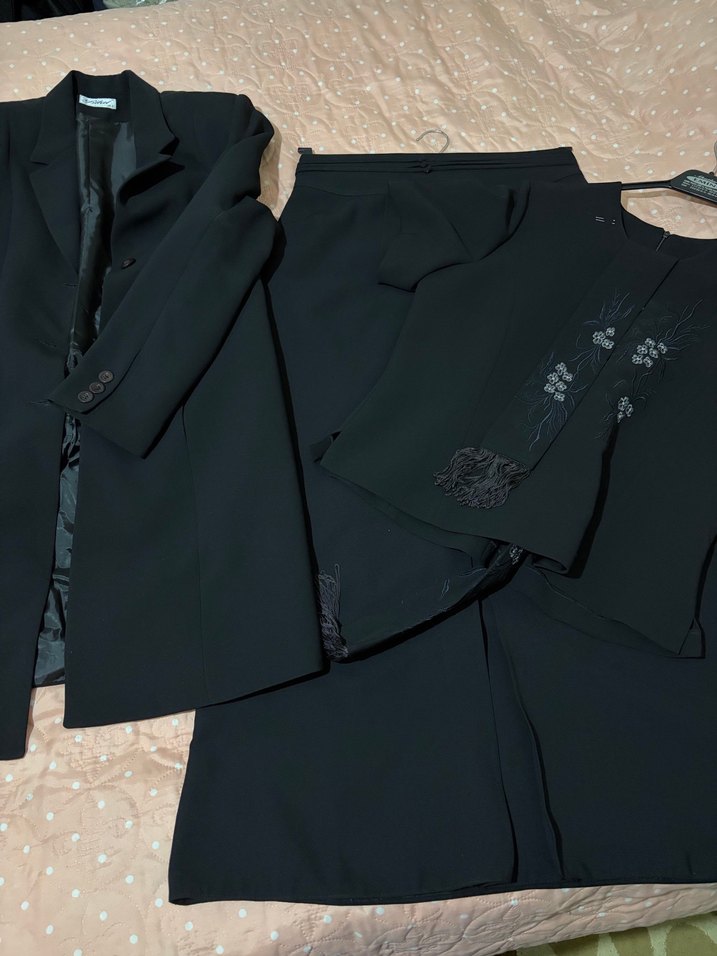 Siyah renkli, uzun kollu, düğmeli ve ipeksi kumaştan yapılmış klasik kesim kadın takımı. Notlu yaka ve uzun boyu ile ofis kullanımı için uygundur. 3 lü takım 44 bedem