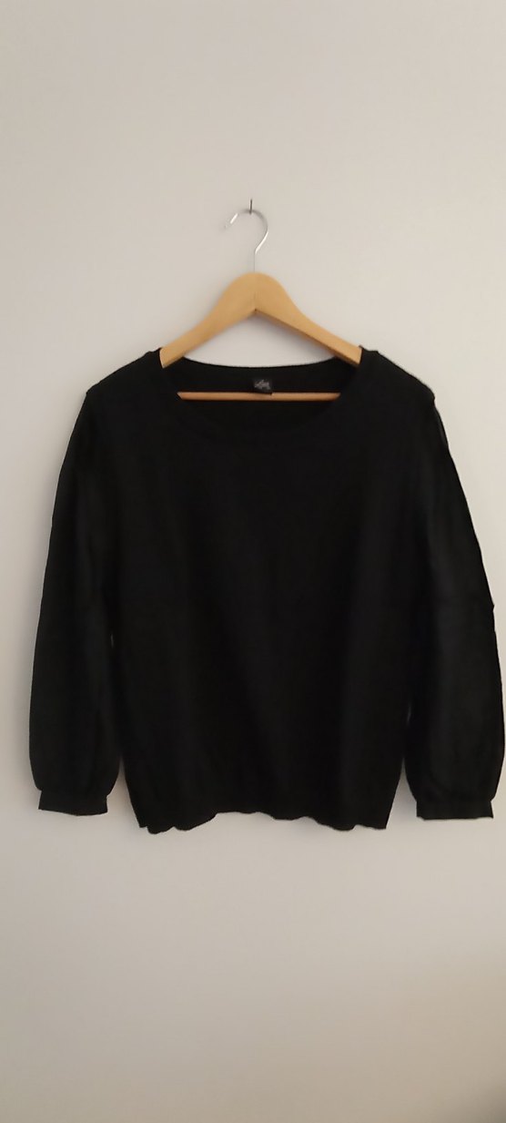 Siyah kotton kumaştan, yuvarlak yakalı, uzun kollu ve bol kesim kadın kazak. Kolları şeffaf ince kumaştır. Bluzun etek uçları hafif simlidir ve yanları yırtmaçlıdır. Minimalist ve gotik tarzıyla günlük kullanıma uygundur.