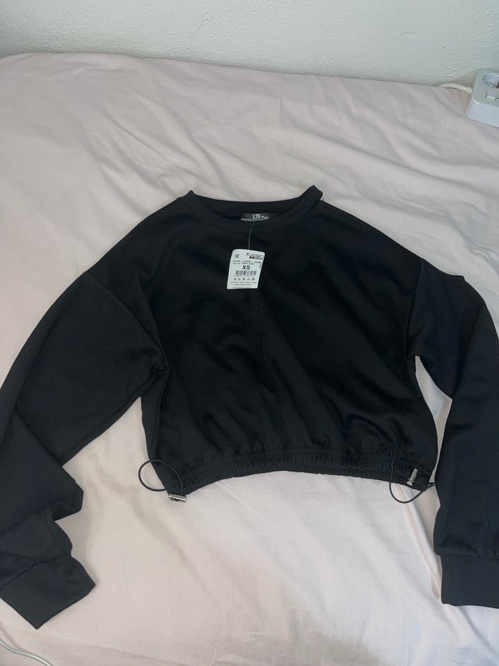 Siyah, uzun kollu ve yuvarlak yakalı kadın sweatshirtü. Rahat kesimi ve yumuşak kumaşıyla günlük kullanıma uygun şık bir parça.
